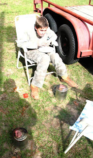 After we finished with the deer we cooked burgers on buddy burners. Buddy burners are stoves we make in RA's. It's a #10 can as a stove and a tuna can with cardboard and wax under it as a burner. Bub had a great time cooking with this in class so I told him we would cook supper on it.